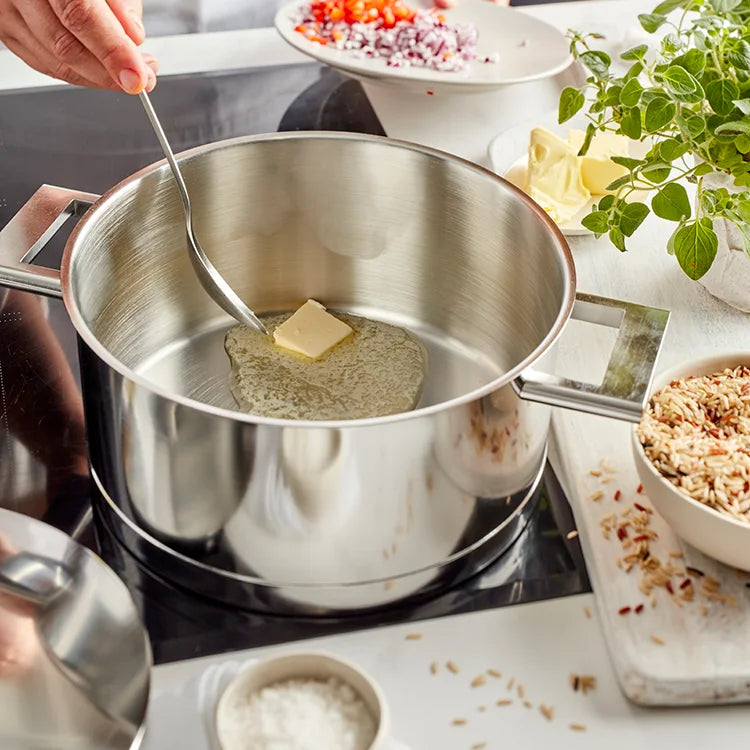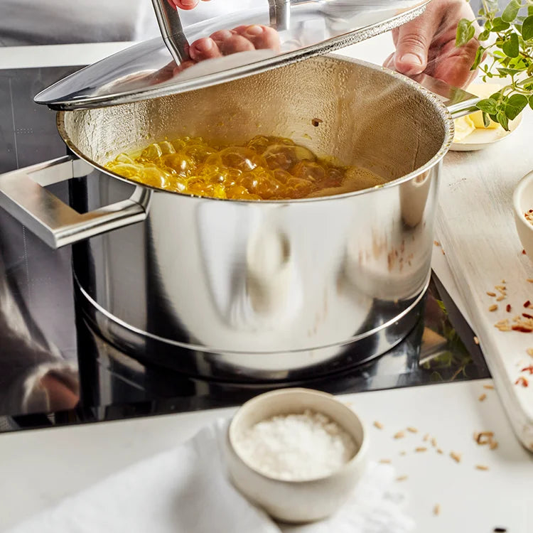 De Demeyere John Pawson 7 kookpan is ontworpen voor wie houdt van eenvoud, topkwaliteit en perfecte controle. Het minimalistische ontwerp past in elke keuken en straalt rust uit. Dankzij het meerlagenmateriaal tot aan de rand warmt de pan snel en gelijkmatig op. De InductoSeal bodem met koperen kern zorgt voor een uitstekende warmtegeleiding, waardoor je tot dertig procent energie bespaart. De dubbelwandige deksel houdt warmte extra goed vast en helpt bij zuinig koken.