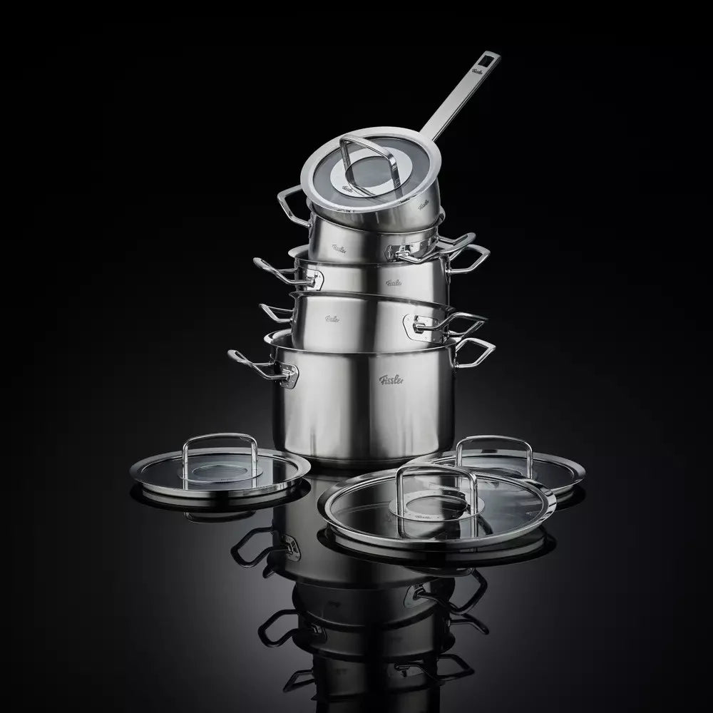 De Fissler Original Profi Collection 5-delig met glazendeksel is gemaakt van hoogwaardig roestvrij staal (RVS), wat zorgt voor een lange levensduur en uitstekende warmteverdeling. De combinatie van hoogglans en geborsteld RVS geeft de pannen een luxe uitstraling en maakt ze niet alleen functioneel, maar ook stijlvol in je keuken.