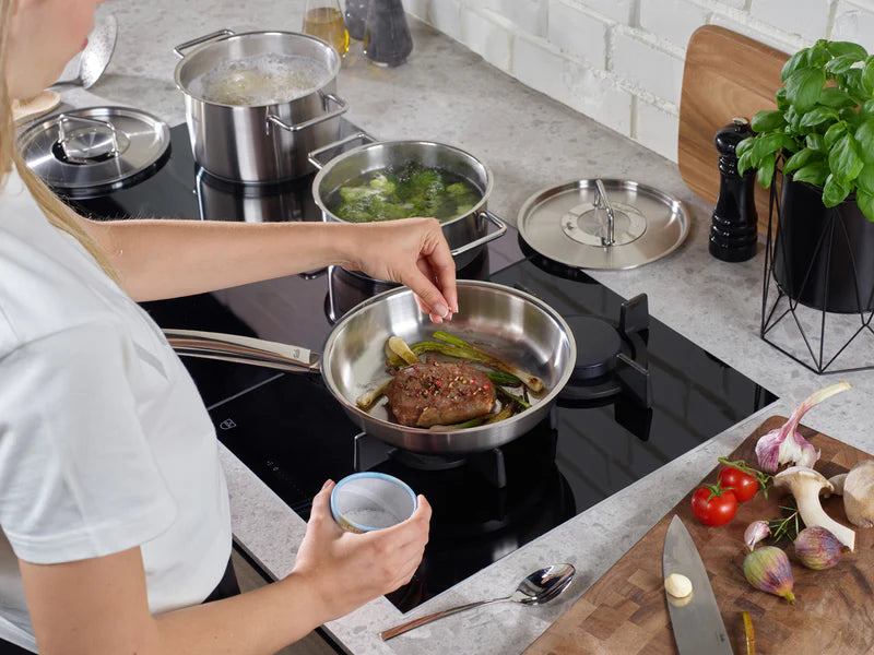 De lange, ergonomische steel met ophangoog ligt stevig in de hand. Dankzij de constructie zonder klinknagels blijven er minder etensresten achter en is schoonmaken extra eenvoudig. De koekenpan is krasvast en vaatwasmachinebestendig, zodat hij er na elke beurt weer als nieuw uitziet. Dit is betrouwbare Fissler-kwaliteit met een lange levensduur — een robuuste metgezel voor startende hobbykoks en gezinnen die kiezen voor degelijkheid en duurzaam kookgerei.