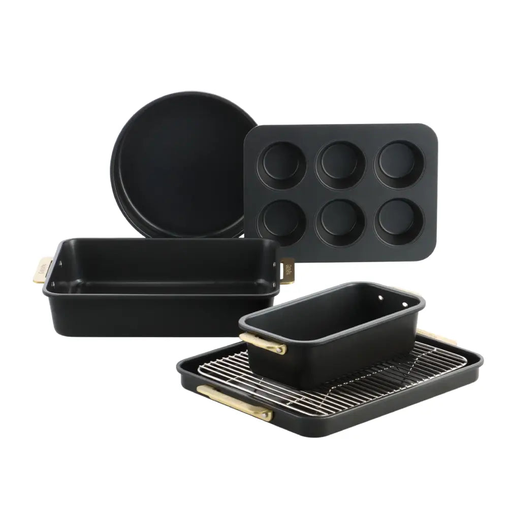 De roestvrijstalen handgrepen met slijtvaste PVD afwerking geven je een stevige en veilige grip bij het plaatsen en uitnemen. De randen zijn netjes afgewerkt, zodat je beslag prettig kunt uitschenken en de vorm makkelijk kunt vasthouden met ovenhandschoenen. Handige extra is het stevige afkoelrek met dikke draden. Daarmee koelen je cakes en koekjes gelijkmatig af en blijven ze knapperig waar je dat wilt. De set is ontworpen voor veelvuldig gebruik en blijft vormvast, ook bij hogere oventemperaturen. Stapel de vormen zorgvuldig om ruimte te besparen in de kast en leg eventueel een doekje ertussen. Met deze complete bakset til je jouw creaties naar een hoger niveau, met betrouwbare resultaten en een ontspannen werktempo in de keuken.