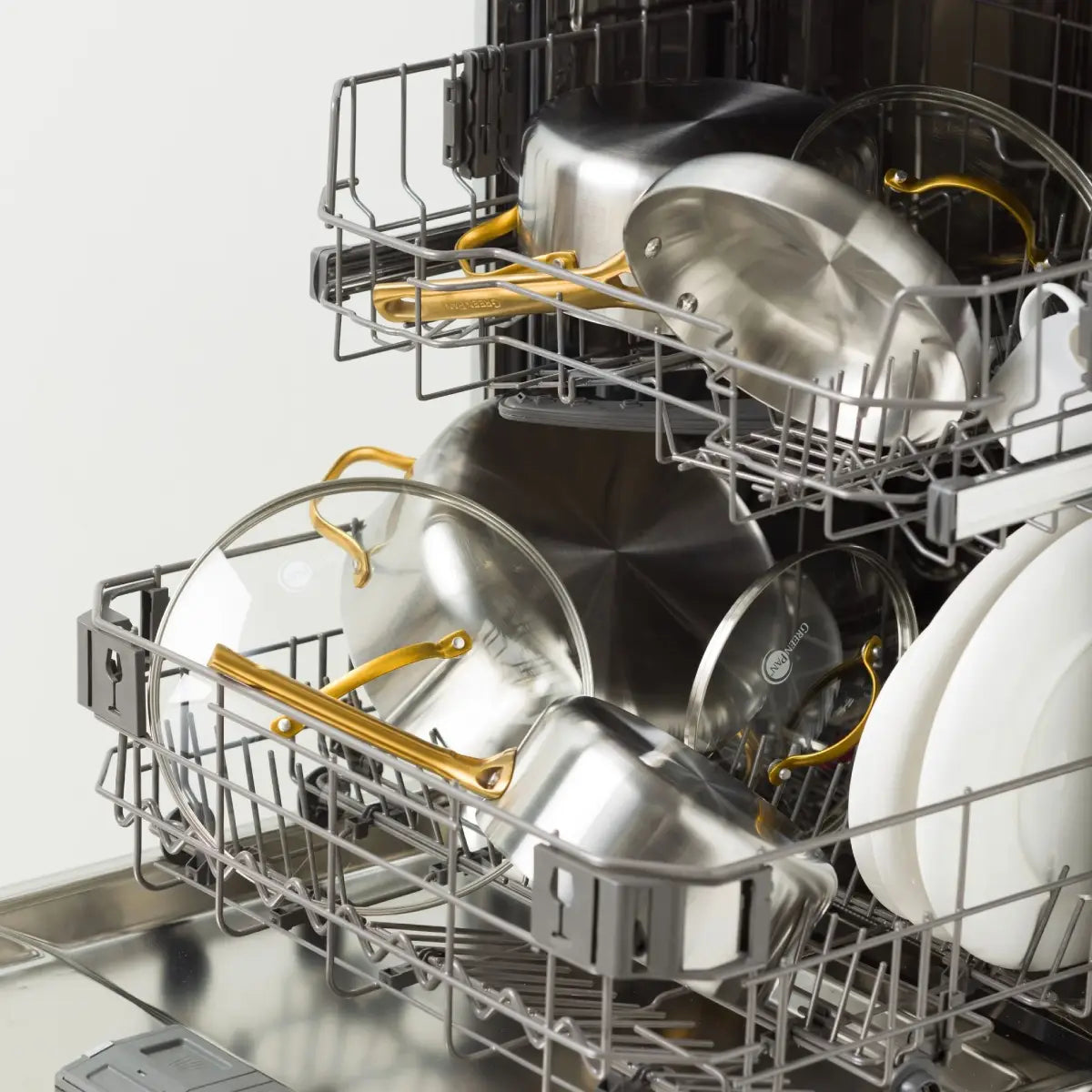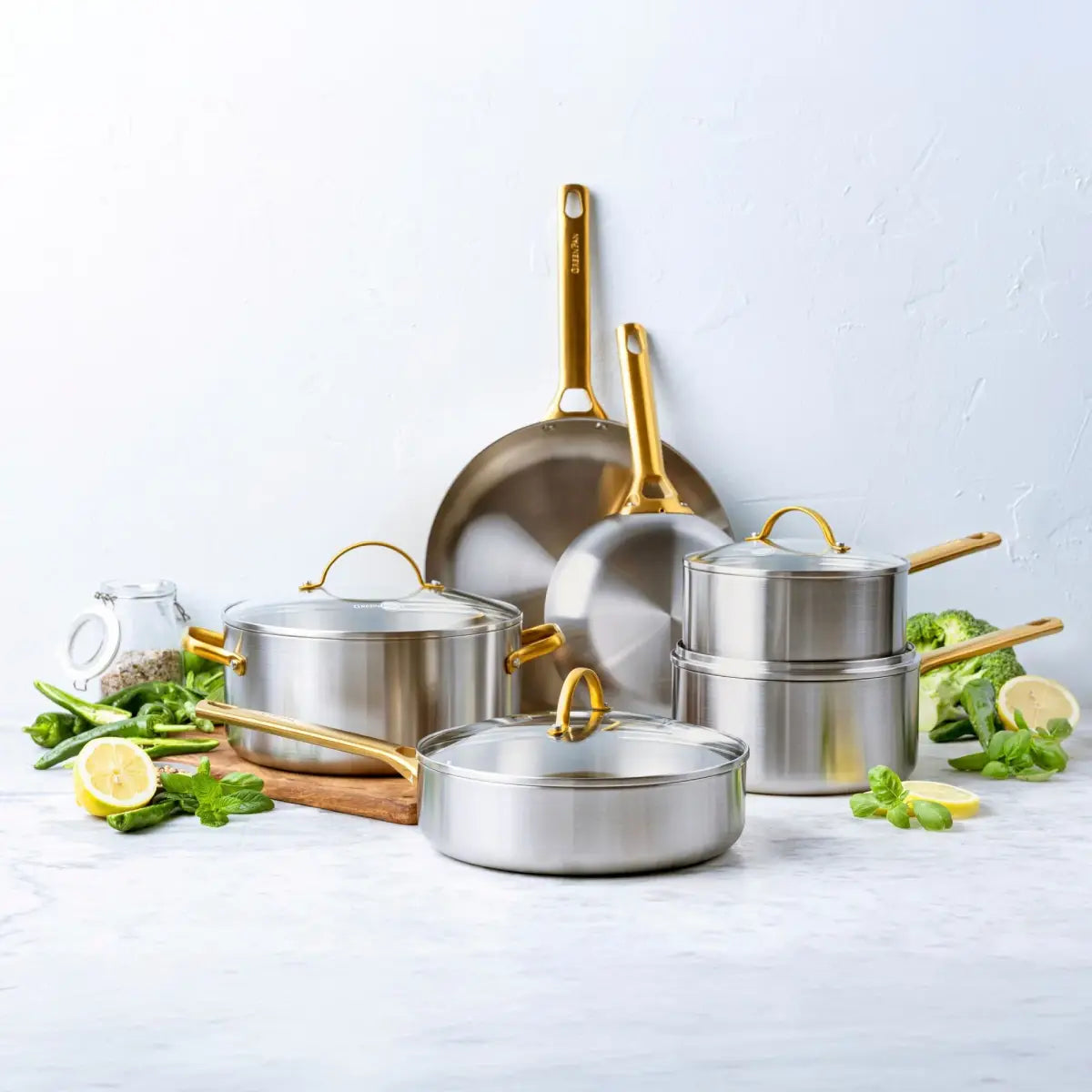 De GreenPan Padova Reserve kookpannenset 5 delig is gemaakt voor thuiskoks die elke dag fijne resultaten willen. De pannen zijn opgebouwd uit drie lagen materiaal, roestvrij staal met een aluminium kern. Zo warmen ze snel en gelijkmatig op en heb je nauwkeurige controle over de temperatuur. De binnenkant is ongecoat voor pure, authentieke smaken. Het staal bestaat voor 55 procent uit gerecycled materiaal, wat deze set een duurzame keuze maakt. De pannen zijn geschikt voor alle warmtebronnen, ook inductie, en kunnen in de oven tot 220 graden. Na het koken mogen ze in de vaatwasser. Het vormvaste ontwerp en de luxueuze goudkleurige handgrepen geven kracht en stijl aan je keuken.