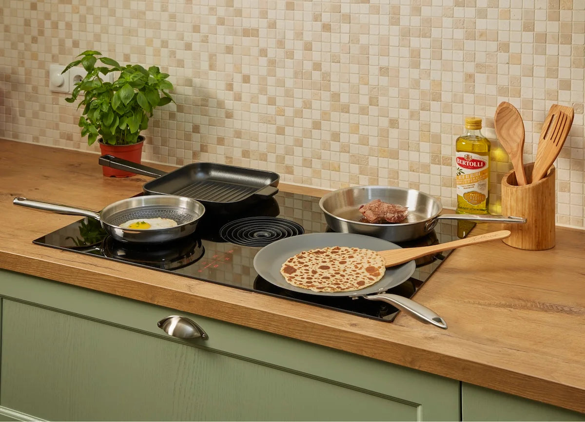 De Habonne Hybrid koekenpan is een fijne keuze voor dagelijks koken. Of je nu een eitje bakt, groenten roerbakt of een stukje vlees krokant wilt bereiden, met deze pan lukt het moeiteloos. De Triply opbouw – twee lagen roestvrij staal met daartussen een laag aluminium – zorgt voor een snelle en gelijkmatige warmteverdeling. Zo voorkom je aanbranden en krijg je altijd een constant resultaat.