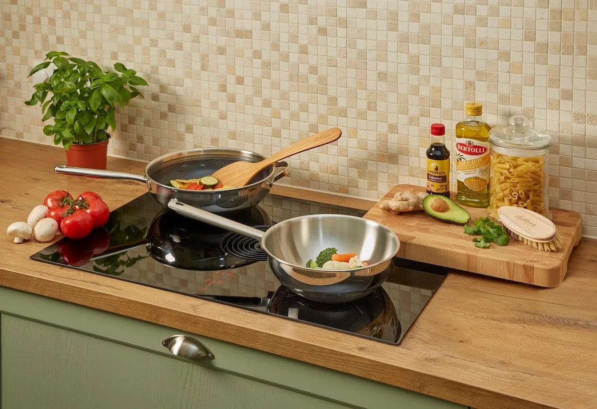 fecte verdeling van olie en warmte. Zo kun je op hoge temperaturen koken, vlees krokant bakken en toch profiteren van een duurzame, sterke pan die lang meegaat.