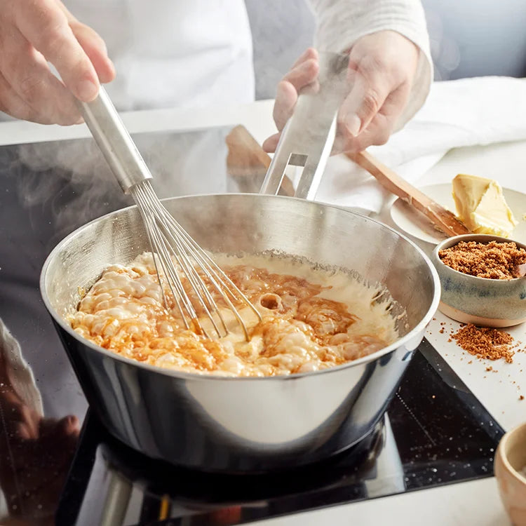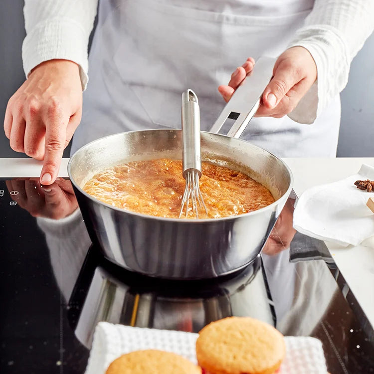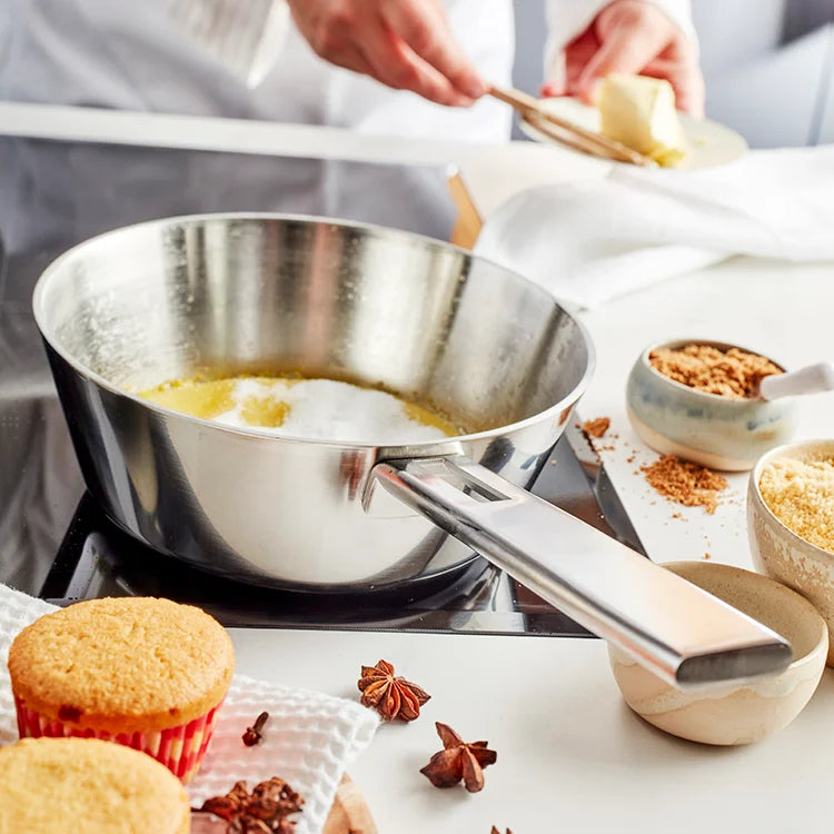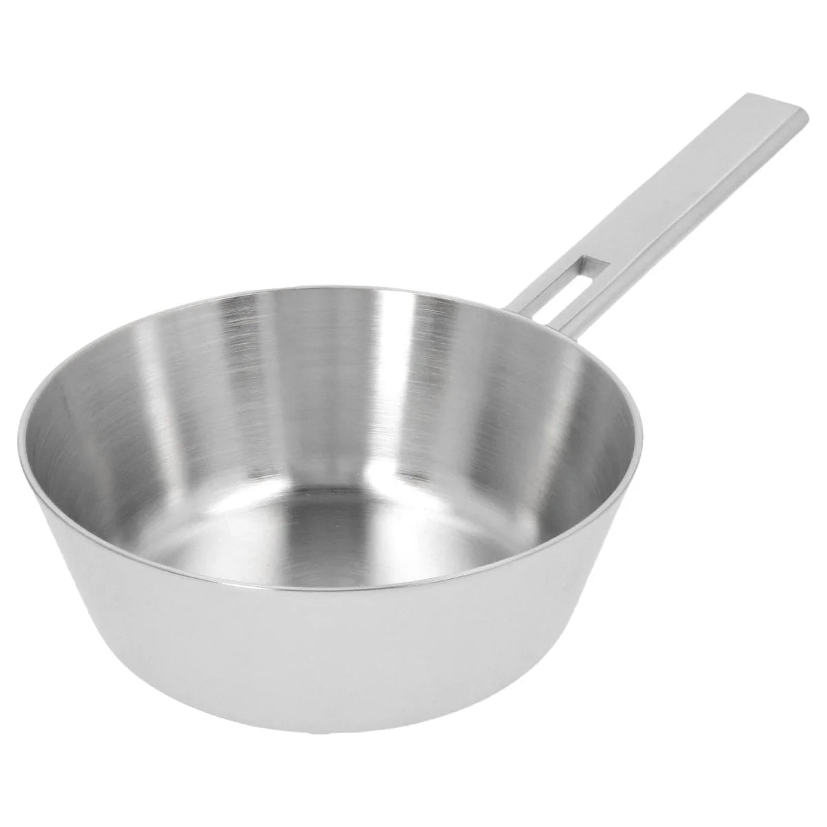 De Demeyere John Pawson 7 conische sauspan is ideaal voor wie graag met controle kookt. De pan heeft een conische vorm met ronde binnenhoeken zodat je sauzen makkelijk kunt roeren en snel kunt inkoken. Het meerlagenmateriaal loopt door tot aan de rand en zorgt voor een gelijkmatige warmteverdeling. De InductoSeal bodem met koperen kern en TriplInduc technologie maakt de pan extra energiezuinig. Je bespaart tot dertig procent energie en kookt stabiel op elke warmtebron.