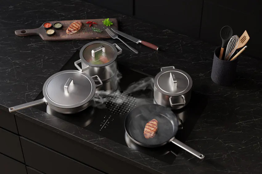 De KOQI Mira pannen zijn geschikt voor alle warmtebronnen, inclusief inductie. Ze werken ook perfect met een downdraft systeem, zodat kookdampen direct goed worden afgevoerd. De PFAS vrij duurzame keramische antiaanbaklaag zorgt ervoor dat eten niet blijft plakken en je met minder olie kunt bakken. Dat is beter voor je gezondheid en maakt koken nog leuker.
