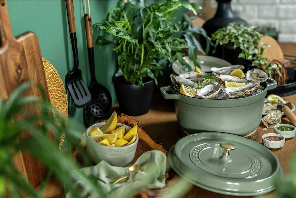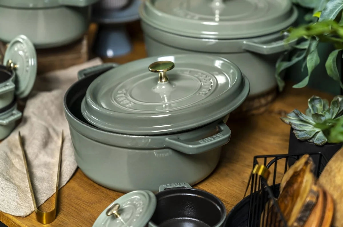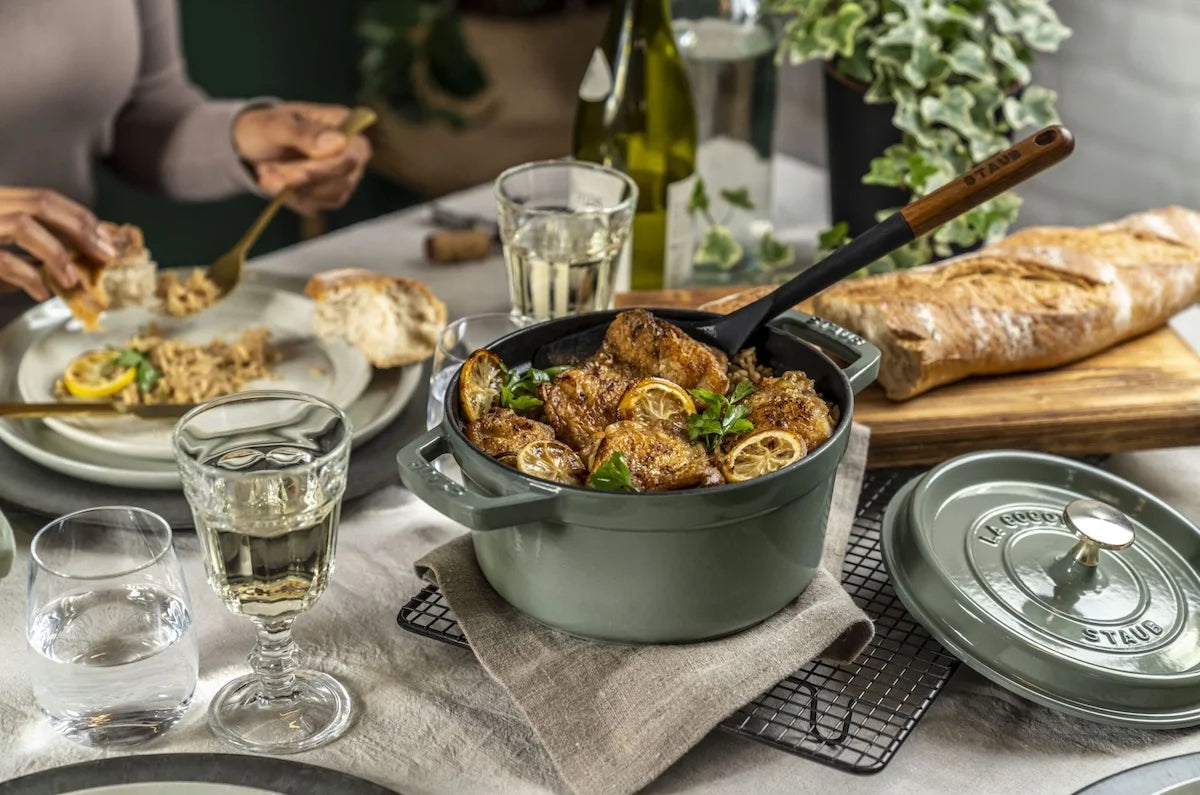 Eucalyptus is ideaal als je houdt van een moderne, rustige uitstraling: subtiel, maar wel echt bijzonder op tafel. Staub scoort vooral op consistentie de warmte blijft stabiel en het Aroma Rain-deksel helpt om gerechten zichtbaar sappiger te houden. Voor slowcooking en braiseren is dit precies het soort pan waar je op kunt vertrouwen, keer op keer.