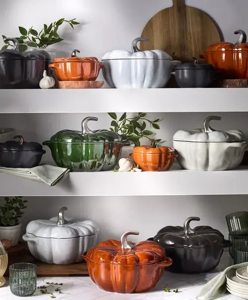 De Staub Pompoen Cocotte in de kleur kaneel is een blikvanger in iedere keuken. Deze ronde gietijzeren pan combineert stijl met kwaliteit en zorgt ervoor dat elk gerecht vol smaak op tafel komt. Het duurzame geëmailleerde gietijzer verdeelt de warmte gelijkmatig, zodat je eten perfect gaart. De binnenkant is voorzien van matzwart email, wat zorgt voor een mooie bruining en diepe smaken. Dankzij het speciale deksel blijft de condens in de pan, waardoor stoofgerechten, soepen of ovenschotels mals en sappig blijven.